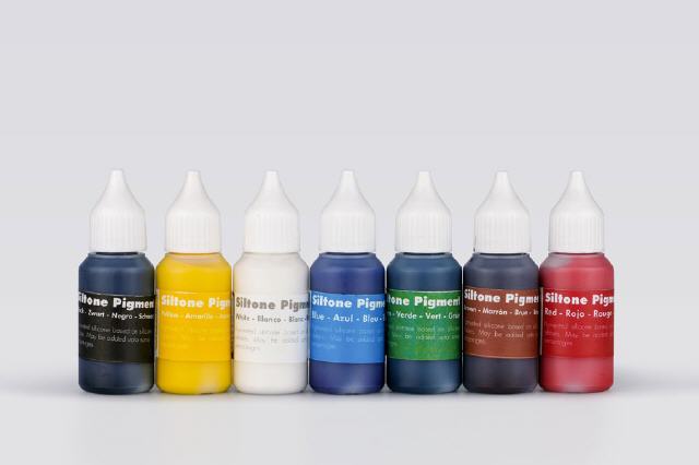 Le kit Siltone Primaires contient 7 x 30 grammes de pigments liquide Siltone dans les couleurs primaires: Jaune, Blanc, vert, marron, bleu, rouge, noir,